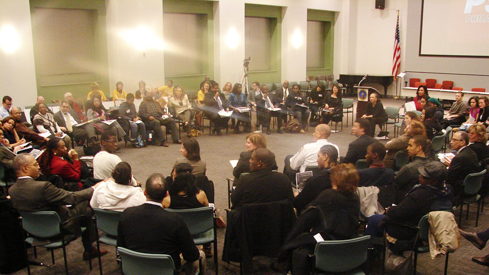 Then, Commissioner Lorene Cary chaired a free-form, talk-show style community discussion, asking all 70-plus individuals to introduce themselves. The audience sat in a circle, with District staff and SRC members scattered throughout. A basket of fruit was provided in the back of the auditorium. At one point, Cary even asked those in the room to take a deep breath together.