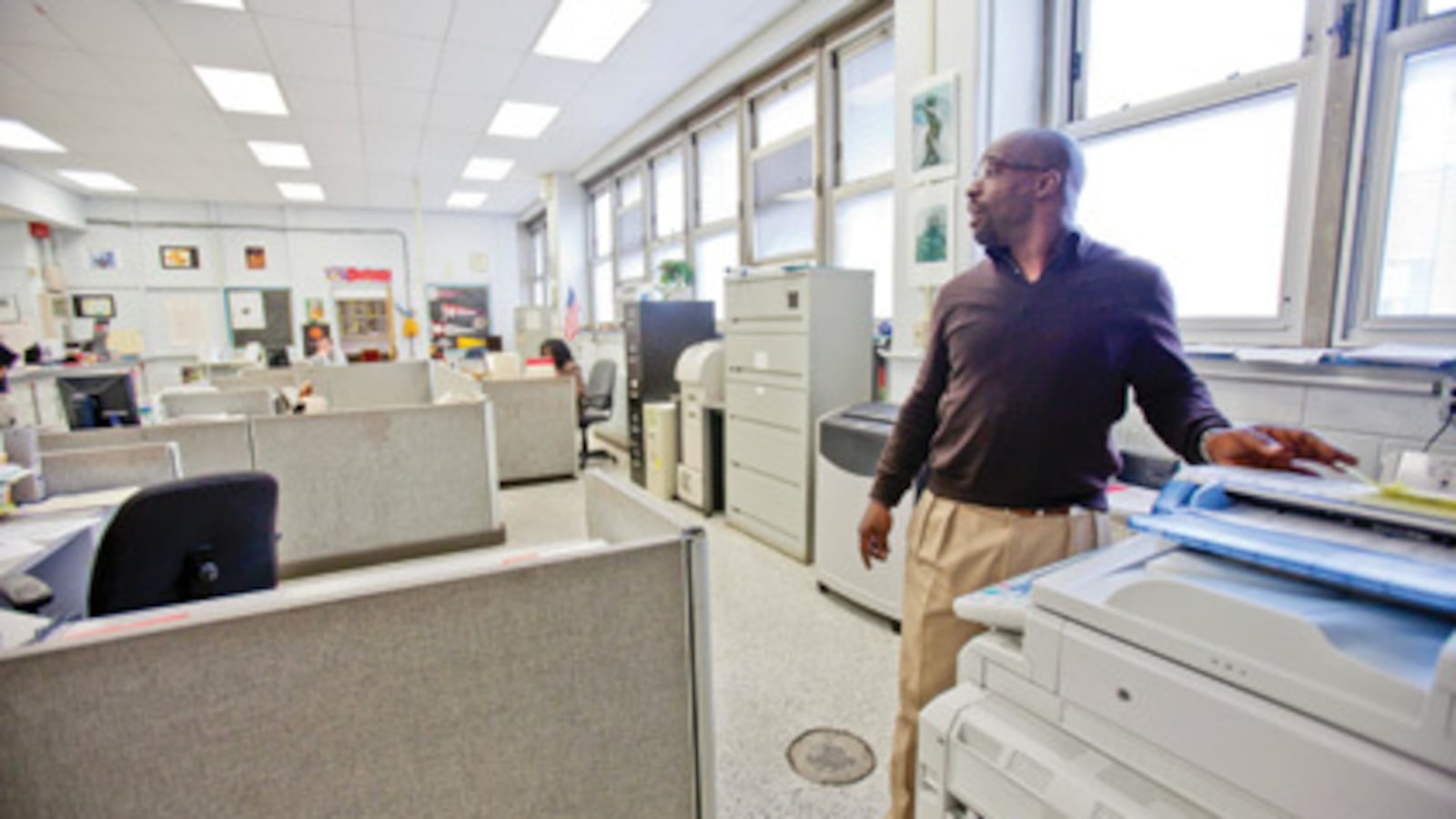 With students mostly gone for the day, Benjamin Franklin High’s lone secretary has headed home, replaced at her desk by Principal Christopher Johnson.