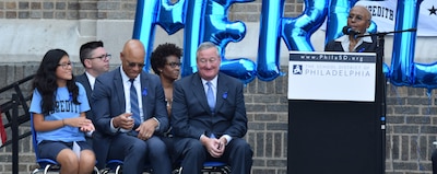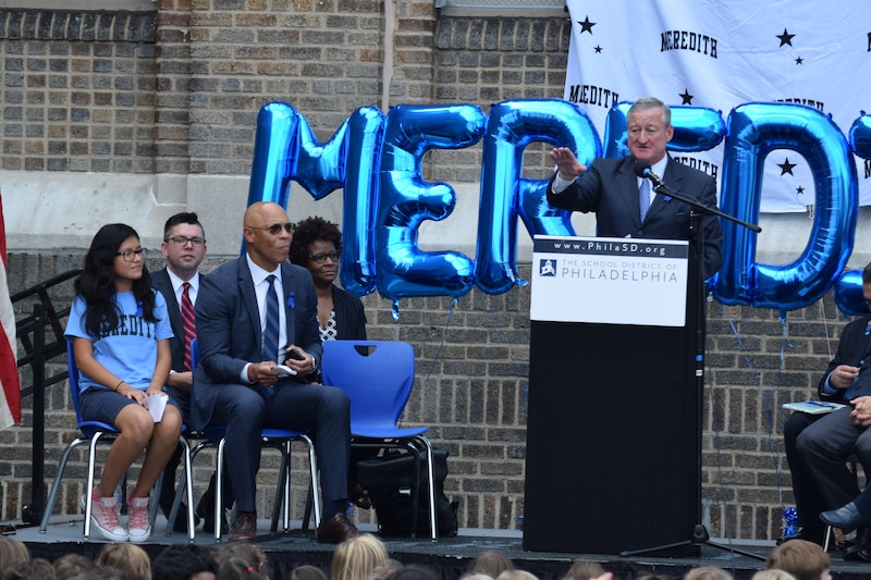 Children in the crowd laughed as Mayor Kenney made faces at them from the stage.