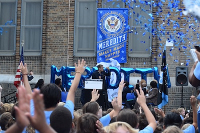 The ceremony was opened by Meredith’s principal, Lauren Overton, a former social studies teacher who is now in her third year as principal. She thanked the school’s teachers and leadership team, and some “very special women who are rock stars in my life: my mom, my grandmother, and my partner Tiff.”