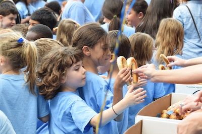 Rita’s Italian Ice donated half the cost of several giant tubs of water ice, and the Home & School Association paid for the rest and bought boxes of M-shaped soft pretzels. Parent volunteers staffed the long tables piled high with treats.