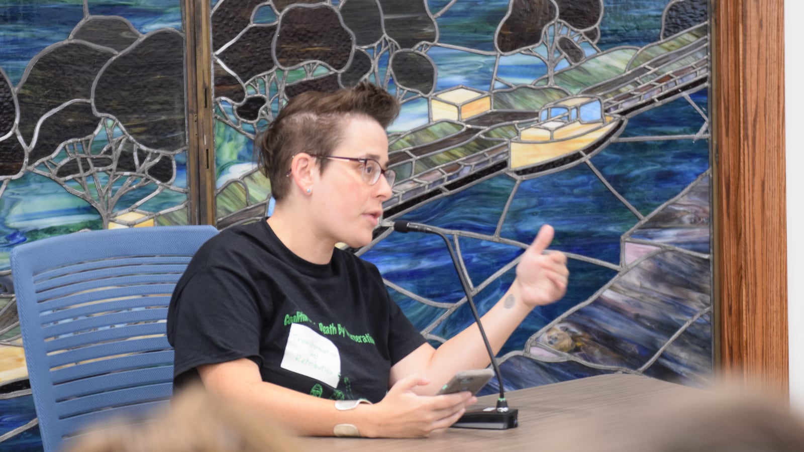 Kieko Glover, who has a daughter at Kearny Elementary School, spent the hour before her testimony rocking her youngest child’s baby carriage back and forth in the audience.