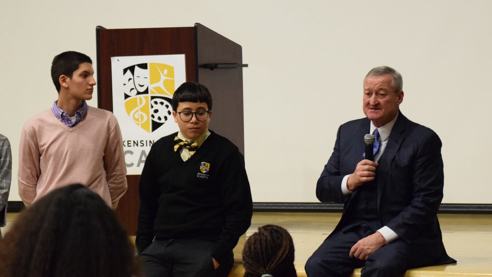 Mayor Kenney sat on the edge of the auditorium’s stage Wednesday at Kensington Creative & Performing Arts High School, speaking to young people about Philadelphia’s increasing homicide rate.