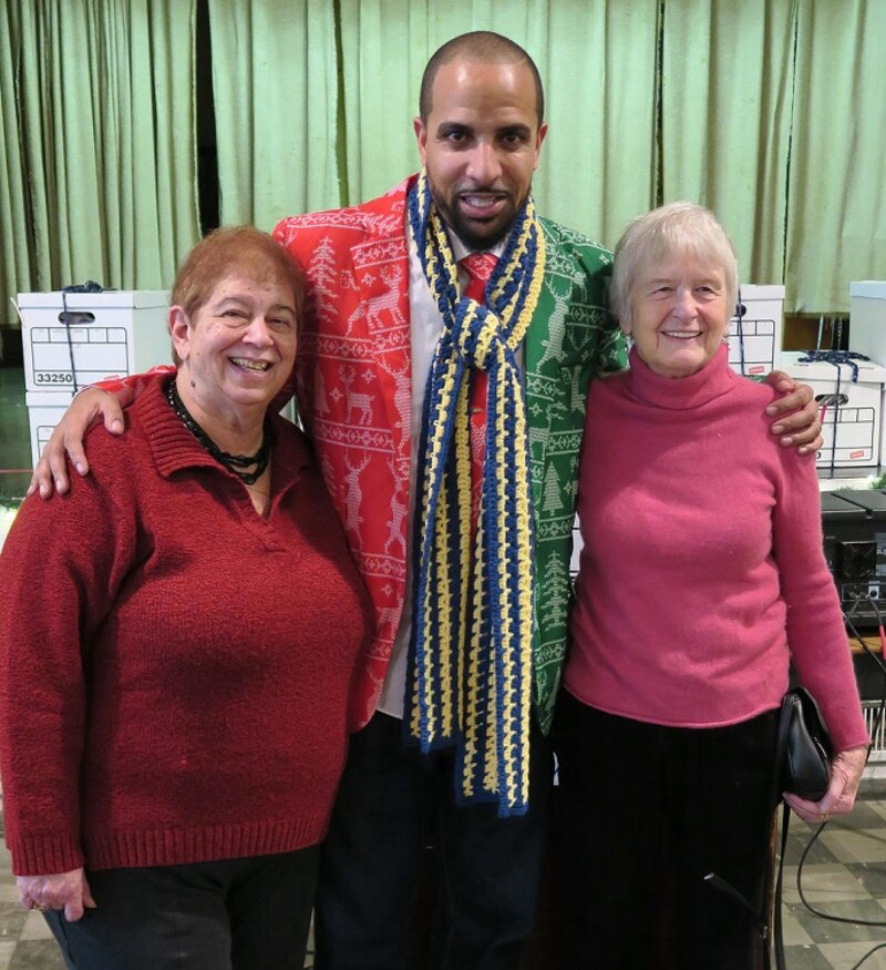 Volunteer Elayne Bender, principal LeRoy Hall Jr., and school volunteer and scarf project organizer Deborah Cooper. (Photo: Jacqueline B. Boulden)