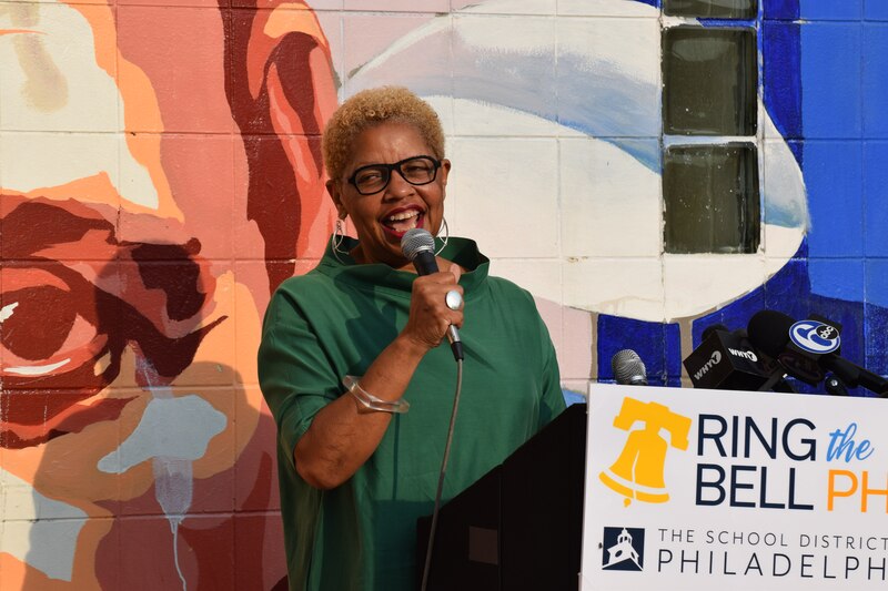 Board of Education President Joyce Wilkerson speaks outside Muñoz-Marin Elementary School in Kensington to celebrate the start of a new school year.
