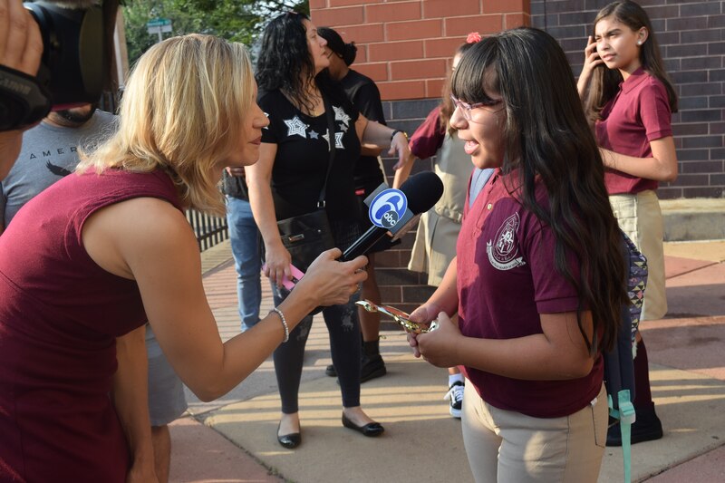 Keili Hernandez-Rogel, a 7th-grade honor roll student at Muñoz-Marin who was named an Attendance Hero, gives an interview to 6ABC News.
