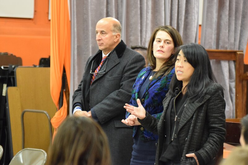 Councilwoman Helen Gym (right) speaks at the meeting at Jackson. Next to her are State Rep. Elizabeth Fiedler and Councilman Mark Squilla. (Photo: Greg Windle)