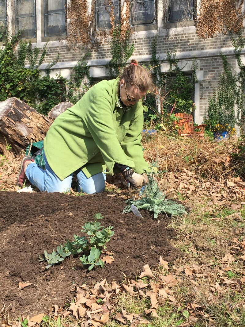 Houston STEM teacher Christine Bush mulches the STEM garden. Photo by Huntly Collins