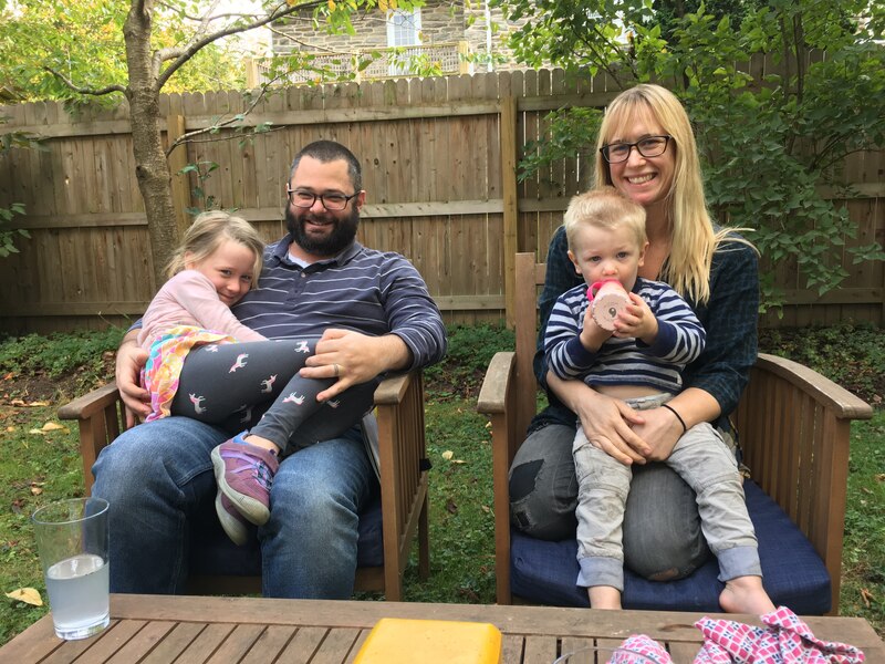 The Bryant family relaxes in their East Mt. Airy backyard. Peter Bryant is holding Alice, a Houston kindergartner. Photo by Huntly Collins