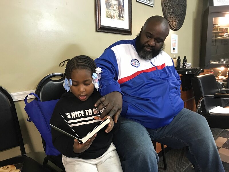 Reading Hero Jasmond “Jazz the Barber” Schoolfield reads to his 5-year-old granddaughter, Harmonee Schoolfield. Photo by Jane M. Von Bergen.