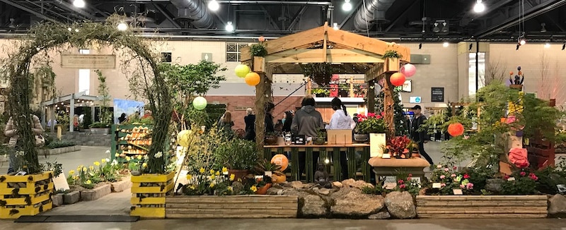 The walk-through exhibit includes a gazebo, with plants branching out in each color of the chakra, as well as origami, water features, and an arch.