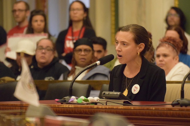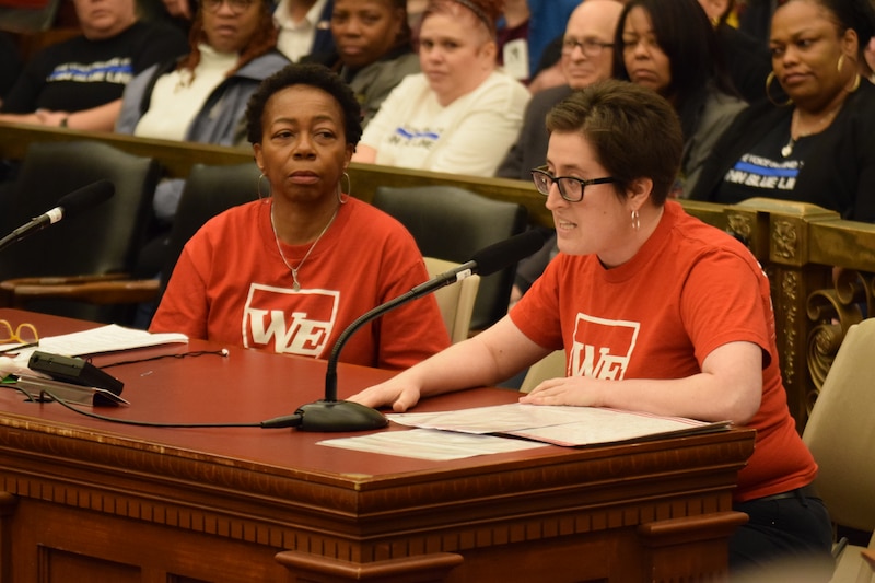 Shira Cohen teaches 6th grade at Feltonville School of Arts & Sciences in North Philadelphia and is also an organizer with the Working Educator caucus. She told Council a story about walking into her classroom in August, three days before school was supposed to start, and finding that part of the ceiling had fallen into the room.