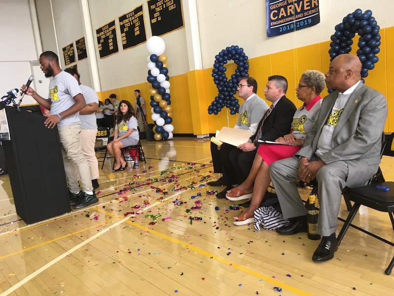 At Carver, Board of Education Chair Joyce Wilkerson praised the school’s achievements. The 920-student school is 68 percent African American, and about 94 percent nonwhite. More than half of the students are from households below the poverty line, and 67 percent will be the first in their families to attend college. But Wilkerson noted that the school boasts a 100 percent college acceptance rate, and its students landed more than $17 million in scholarships last year – the highest amount ever for a graduating class at the school.