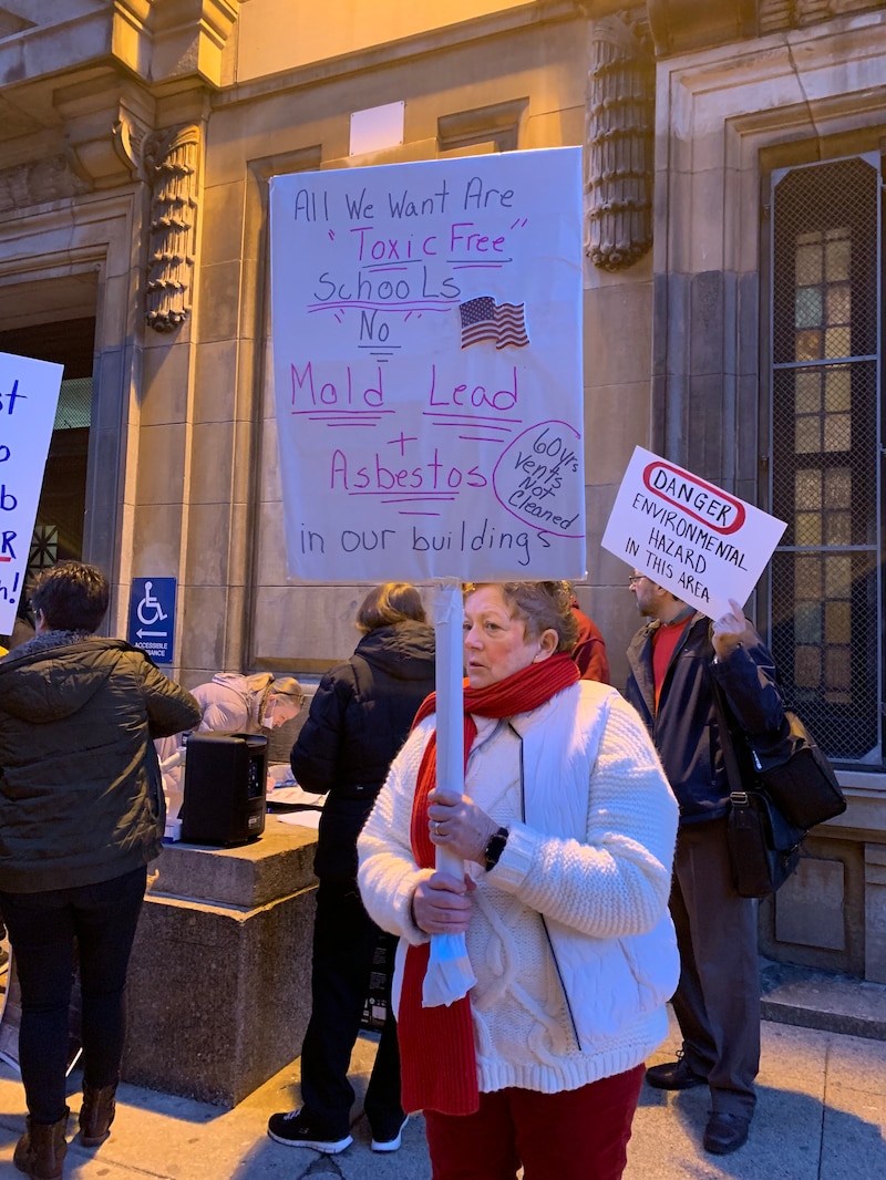 Some in the crowd wore masks and periodically broke out in chants of “What do we want? Safe schools! When do we want them? Now!” Several teachers and former students blamed health problems — their own and those of others — on toxins in the building, including mold, and dust from asbestos and lead paint.