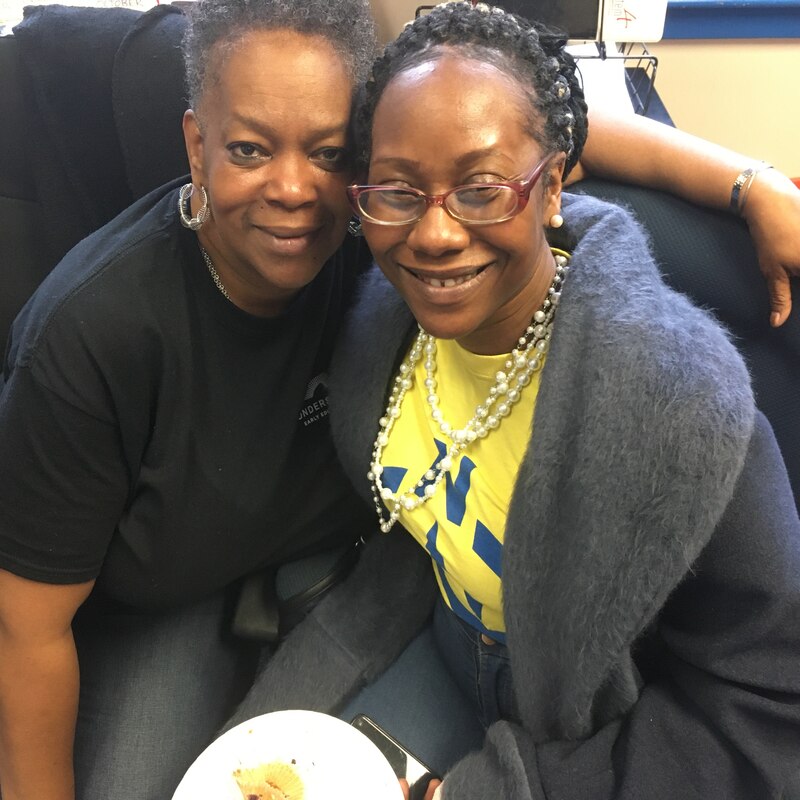 Wonderspring staffer Sheila Bonner (left) with parent Rachel Hayes. Photo by Bill Hangley.