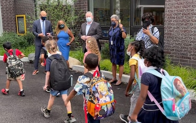 Superintendent William Hite and Mayor Jim Kenney welcomed students at a celebratory “ring the bell” event to the brand-new building housing Powel Elementary School and Science Leadership Academy Middle School, also known as SLAMS. Board of Education President Joyce Wilkerson, City Council member Jamie Gauthier and Board member Cecelia Thompson were also present.