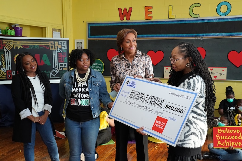 Robinson’s dedication — she purchases additional school supplies and teaches extra classes, such as art — recently caught the attention of “Good Morning America.” Anchors T.J. Holmes and Robin Roberts, and the creator and star of “Abbott Elementary,” Quinta Brunson, surprised Robinson in person. The school received $20,000 in Scholastic books, $40,000 from Wells Fargo, and a new mural from Mural Arts Philadelphia.