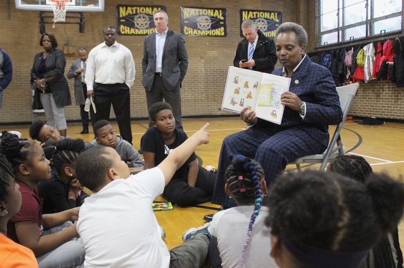 The mayor spent some time with children at Kennicott Park in the Kenwood neighborhood Wednesday morning reading “Lilly’s Purple Plastic Purse,” a story about a young girl who wants to become a teacher.