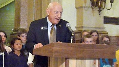Sen. Rollie Heath, D-Boulder, was flanked by 4th-graders from Wildcat Mountain Elementary in Douglas County as he launched his school-funding ballot measure campaign May 16.