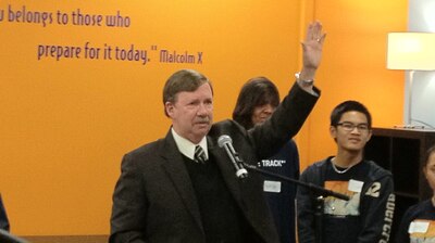 Aurora Superintendent John Barry exults at the opening of the College Track-Summit 54 headquarters Thursday. (Nicholas Garcia)