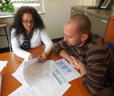 Patty Hernandez talks with parent John Simpson during a LENA feedback session.