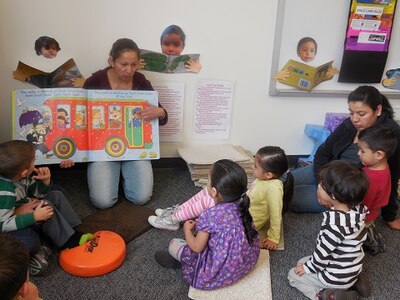 A parent reads to children in a “Play and Learn” group in northeast Denver. The children all wear the LENA device every few months so their parents or caregivers can get feedback about their verbal interactions.