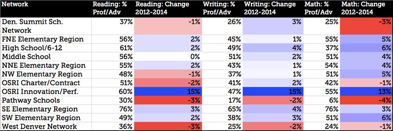 This year’s results show that the network strategy has produced mixed results. The Far Northeast turnaround network and the West Denver Network, which is also targeted at struggling schools, both saw declines in multiple subject areas. Charter schools saw a slight decline in performance in both reading and math, and overall performance remained slightly below the district average. And the district’s alternative pathways schools, which serve students who are at risk or have already dropped out of school, saw their already low levels of proficiency decline further.