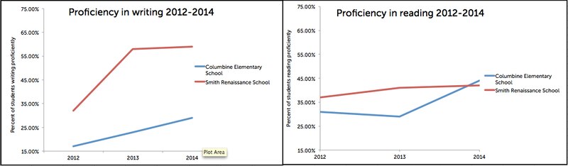 For example, KIPP Montbello, which serves a predominantly low-income student population, has seen an 18 percentage point gain in reading proficiency since 2012. One of KIPP’s other campuses, Sunshine Peak Academy in southwest Denver, saw a nine point jump in reading proficiency in the same time period. Some district-run schools saw similar gains, such as a 10 point jump in the number of students writing proficiently at Stapleton’s McAuliffe International School.