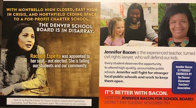 The mailer was paid for by Brighter Futures for Denver Students, an independent expenditure committee that is supporting the candidacy of Jennifer Bacon, who has worked as a teacher, administrator and lawyer. As of the last reporting deadline, the group had brought in $139,000 from the Denver teachers union and the Colorado Education Association, the state’s largest teachers union.
