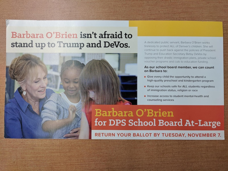 So when the political newcomer running to represent heavily Latino southwest Denver on the Denver school board saw an election campaign mailer that pictured her face alongside those of President Donald Trump and Education Secretary Betsy DeVos, she felt “genuine shock.”