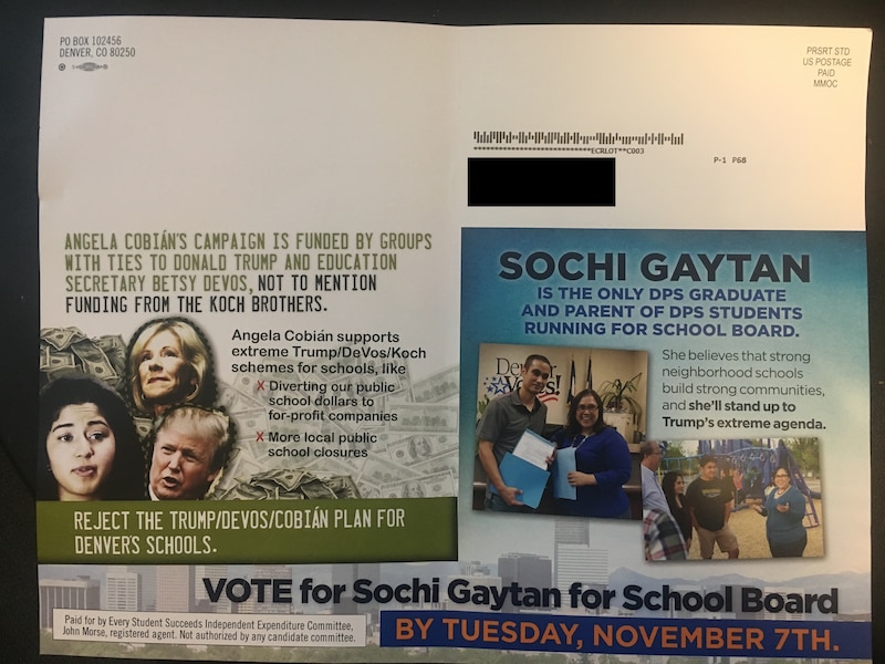 The mailer juxtaposing Cobián with Trump and DeVos was paid for by Every Student Succeeds, an independent expenditure committee bankrolled by funds of the Colorado Education Association, the state’s largest teachers union, and the Aurora and Denver teachers unions.