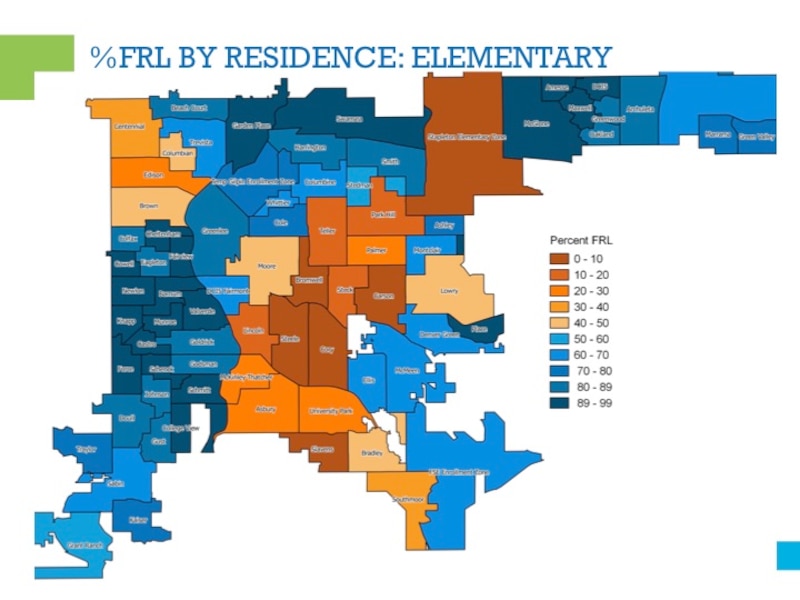 This map shows the percentage of students who qualify for free or reduced-price lunch, a proxy for poverty, in each elementary school boundary. (Denver Public Schools)