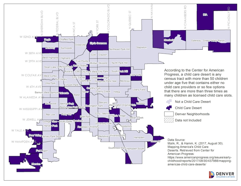 Nine of Denver’s 78 neighborhoods, including Elyria-Swansea, are classified as child care deserts, according to data from a recent Center for American Progress report. Parts of more than a dozen other neighborhoods also earn that designation.