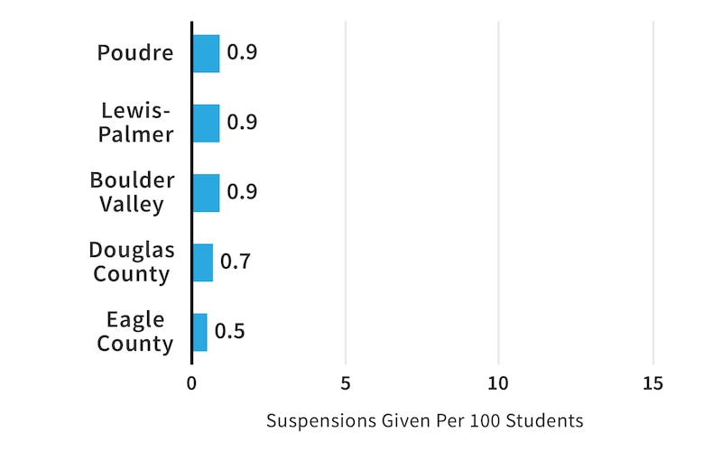 One exception is the 7,000-student Eagle County district, which has the lowest suspension rate among the five. Students of color make up 55 percent of enrollment and 37 percent of students qualify for free or reduced-price meals, a proxy for poverty.