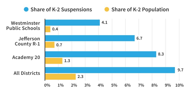 Of Colorado’s five largest districts, which educate about 75,000 students in kindergarten through second grade, Jeffco had the highest rate of early elementary suspensions last year, followed by Aurora. While the rates increased for both districts compared to the previous year, each has recently embarked on new efforts to prevent student suspensions.