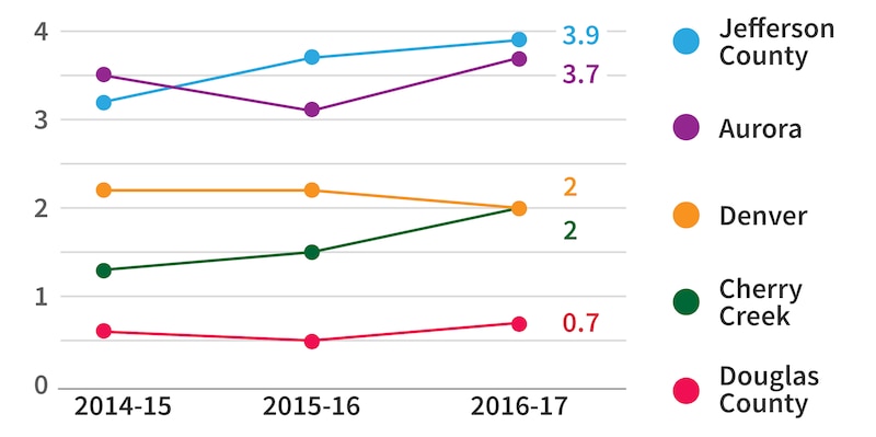 Suspension rates are dropping in Denver, and climbing in the state’s other four largest districts.