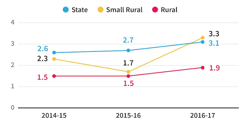As a group, small rural districts — those with less than 1,000 students — are suspending early elementary children at about the same rate as non-rural districts — giving just over 3 suspensions per 100 students. Rural districts — somewhat bigger than “small rurals” but still under 6,500 students — suspend less frequently, giving out 2 suspensions per 100 students.