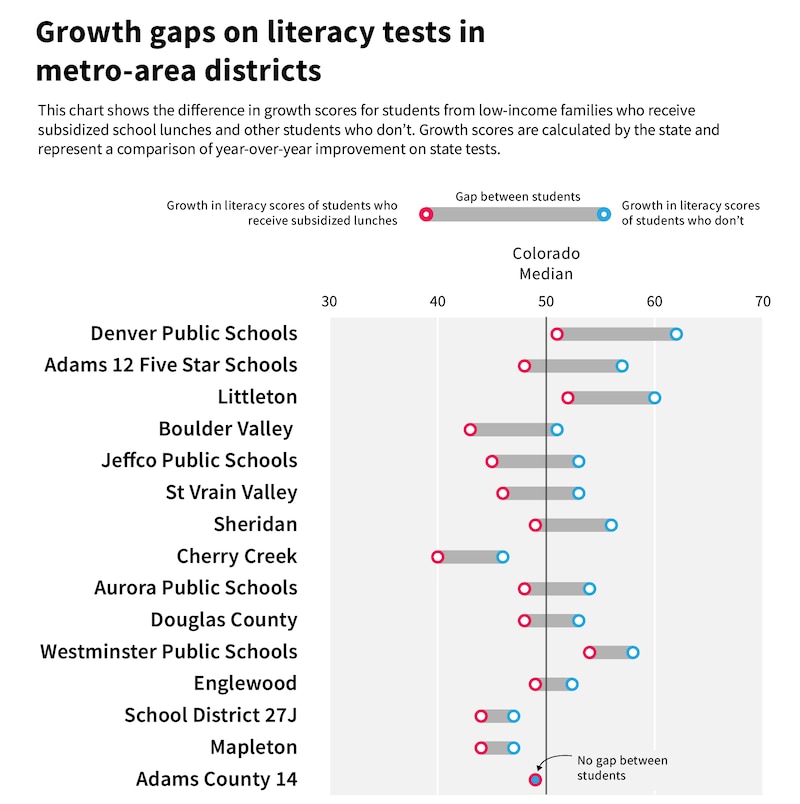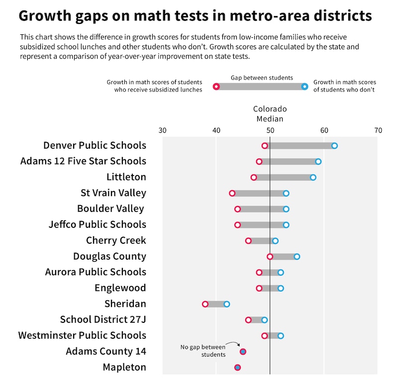 On the whole, Colorado students in grades 3 through 8 who come from low-income families scored lower on literacy and math tests taken this past spring than students from higher-income families did. That gap has persisted for years here and across the nation.