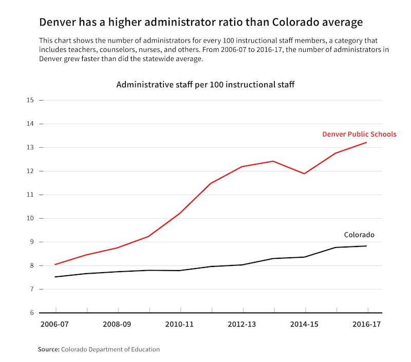 In the 2016-17 school year, Denver had one administrator for every 7.5 instructional staff members, a category that includes teachers, librarians, nurses, and others. The statewide average was one administrator for every 11.3 instructional staff members.