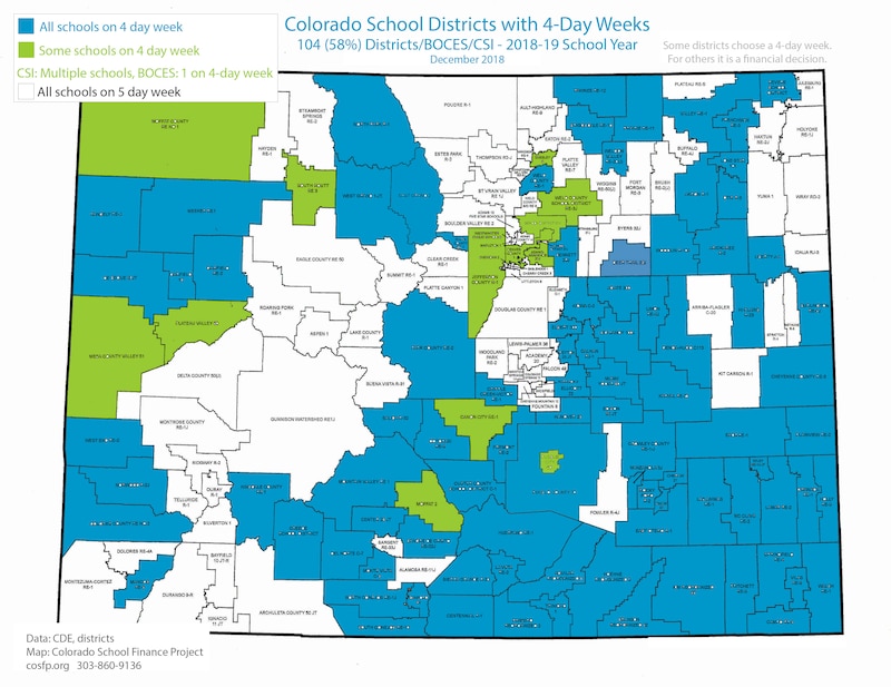 This school year, state data shows 104 of Colorado’s 178 school districts — serving more than 80,000 students — operated on four-day weeks, up from just 39 in 2000. In fact, Colorado has the highest proportion of school districts operating on four-day weeks in the country, according to the National Conference of State Legislatures.