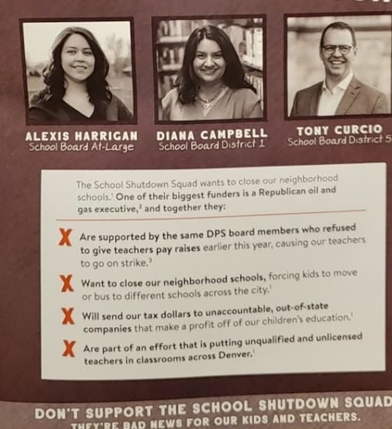 The executive director of the Denver Classroom Teachers Association, Lawrence Garcia, referred questions about the mailer to the independent expenditure committee that paid for it, called Students Deserve Better.