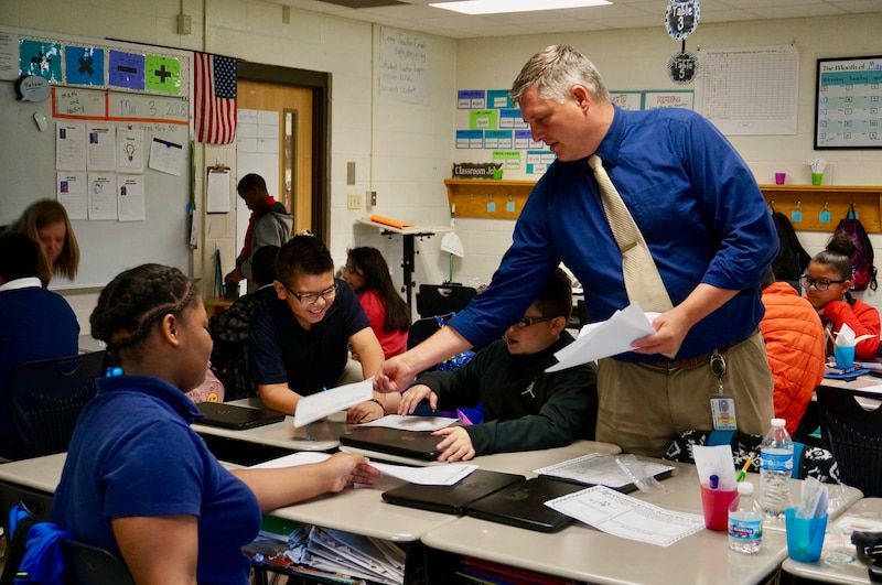 “I was wary,” said Steve Carr, who teaches sixth-grade math. But Brandon Warren, the classroom leader he works with, helps him without being prescriptive, Carr said.