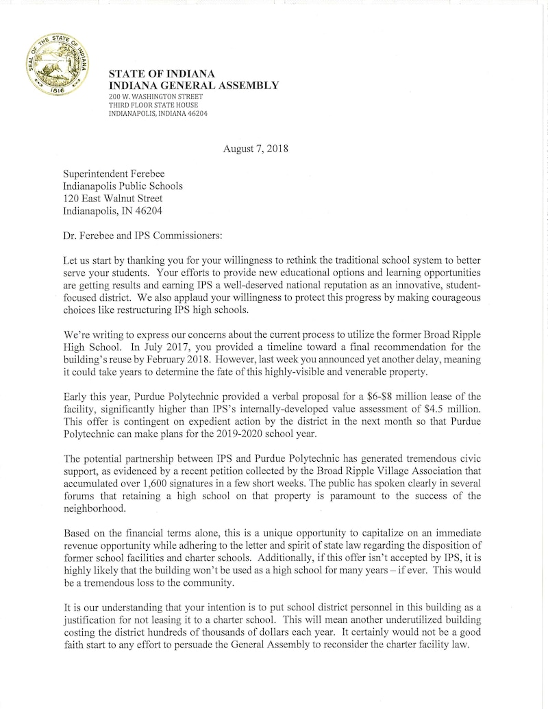 The letter is the latest volley in a sustained campaign from Broad Ripple residents and local leaders to pressure the district to lease or sell the desirable building to a charter school. The district is instead considering steps that could eventually allow them sell the large property on the open market.