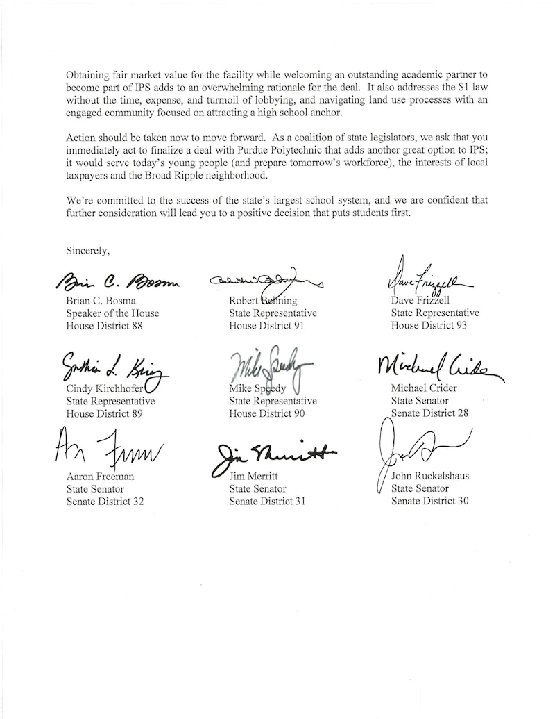 It’s an important development because it was signed by House Speaker Brian Bosma and chairman of the House Education Committee Bob Behning, two elected officials whose support would be essential to changing a law that requires the district to first offer the building to charter schools for $1. Both are Republicans from Indianapolis.