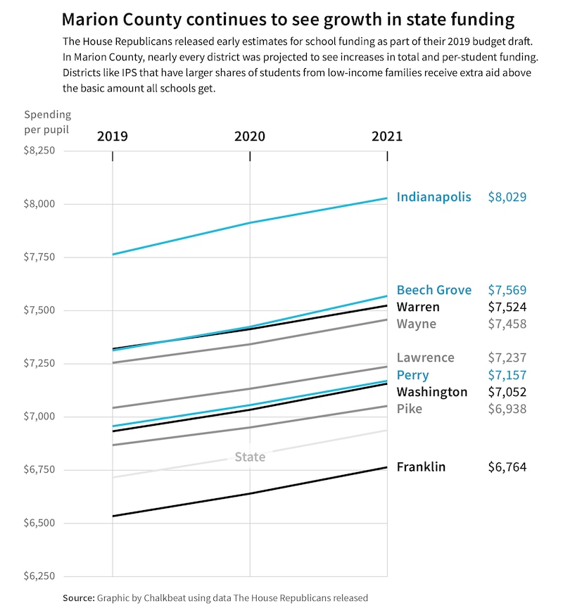 Every district in Indianapolis is tentatively slated to get more state dollars per student under House Republicans’ 2019 budget plan released this week — exceeding some school leaders’ expectations.