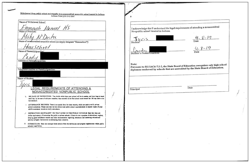 Candy, however, said she does not recall seeing the form before getting it with Tyris’ school records, and she did not discuss home schooling with any staff from Manual.