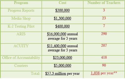 By reducing spending on developing, administering, and grading tests, and by cutting the department’s media relations office, the DOE could save more than $57 million a year, De Blasio’s office found. That would be enough to support the salaries of 1,038 teachers who earn an average of $50,000 a year.