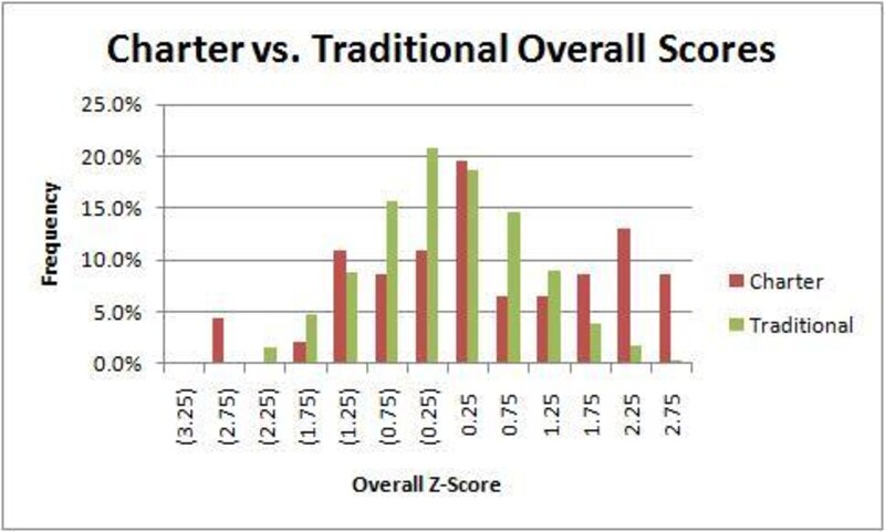 I compared the results for the 46 charter schools with the 1,307 traditional schools. Here is the workbook with my additional calculations and results.
