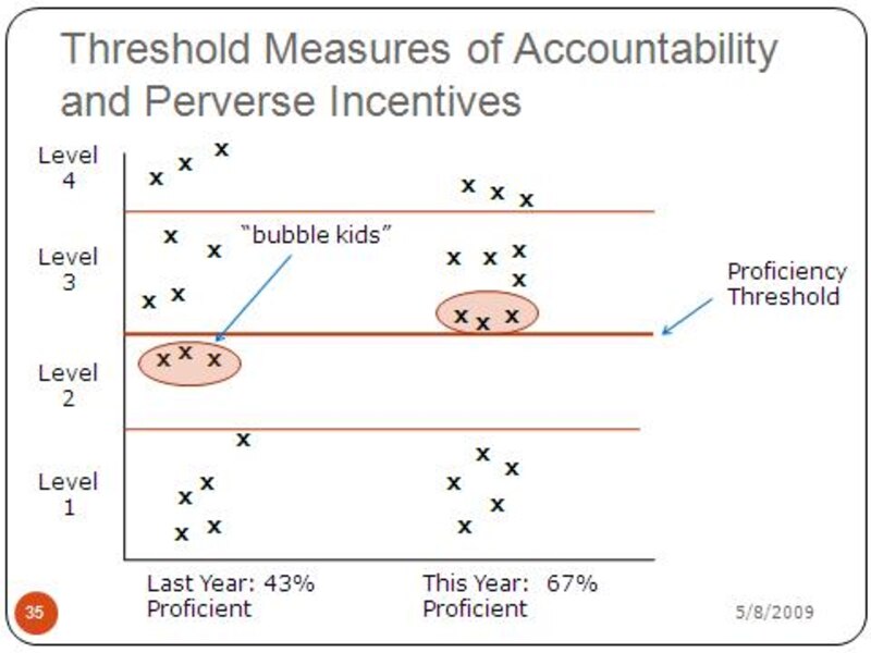How might we explain why the percentage point increase in the percent of students who achieve the proficiency standard exceeds the percentile increase in the average scale score? One possibility is that the gains that were observed from 2008 to 2009 were concentrated in the range of scores near the proficiency threshold. Boosting the scores of students near the threshold just a bit could push them over the bar without dramatically increasing the overall distribution of achievement. We can’t be sure that this is what’s happening, but the figure below gives a graphic representation of the process. The phenomenon at issue is known as focusing on the “bubble kids,” those students whose performance is just below the threshold. In the figure, moving the three “bubble kids” from just below the proficiency bar to just above it increases the percentage of students who are proficient from 43% to 67%, a 24 percentage point increase. My colleague Jennifer Jennings was influential in bringing to national attention the incentives that threshold-based accountability systems such as No Child Left Behind create for focusing on the bubble kids to the exclusion of other students.