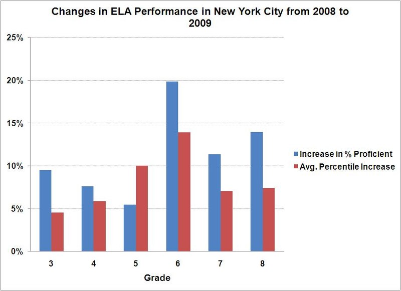 I’d love to believe that the increases in performance observed on the ELA assessment in New York City and across the state represent real and enduring changes in what students know. Seeing gains of similar magnitude on the 2009 National Assessment of Educational Progress would go a long way in convincing me.